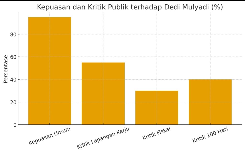 Kawaldata.com — Evaluasi publik terhadap kepemimpinan Gubernur Jawa Barat, Dedi Mulyadi, menampilkan potret yang kompleks. Data kualitatif yang dihimpun dari laporan media massa dan analisis sentimen publik memperlihatkan dua sisi berbeda: di satu sisi, kepuasan publik terhadap figur Dedi sangat tinggi, hampir mencapai 95 persen. Namun, di sisi lain, kritik substantif terhadap efektivitas kebijakan juga cukup tajam, terutama pada sektor lapangan kerja, pengelolaan fiskal, serta capaian 100 hari kerja pertama.